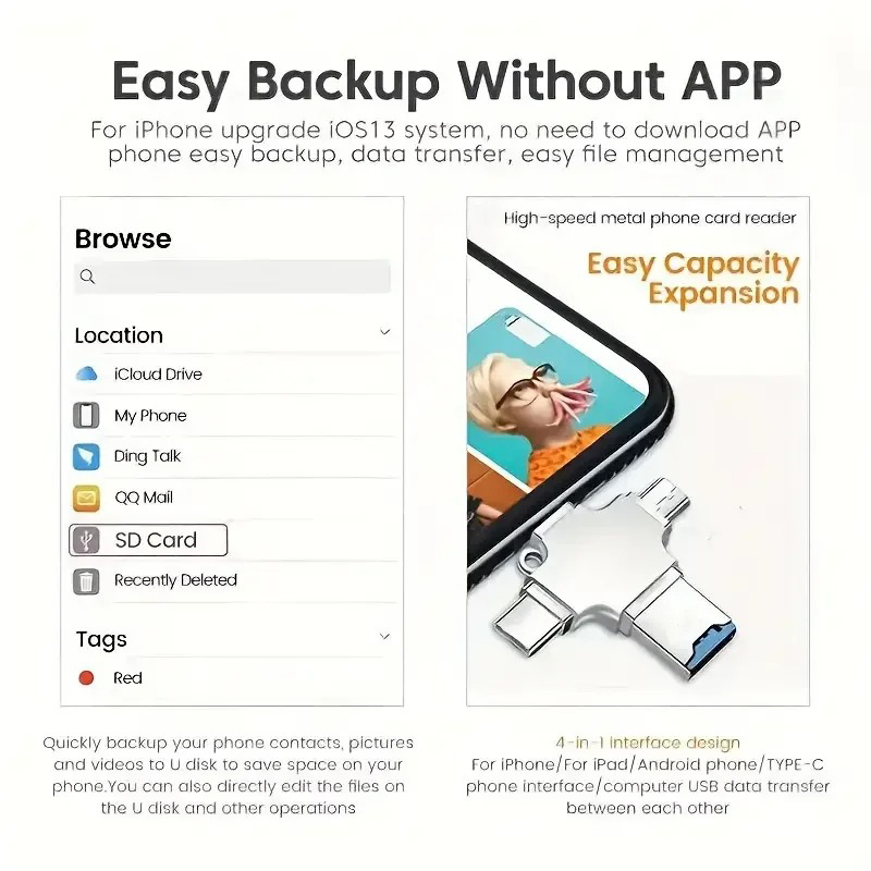 Ingin mengakses file yang ada di flashdisk Anda lewat smartphone? Gunakan saja OTG dari Y-DISK. OTG ini unggul dengan beragam jenis port yang berbeda mulai darilightning, micro USB, dan USB type C. Dengan begitu, OTG inimendukung hampir semua jenis smartphone yang ada di pasaranbaik smartphone android ataupun iphone. Selain itu, tidak hanya flashdisk saja yang dapat Anda gunakan, OTG ini juga dilengkapi slot kartu micro SD sehingga kartu micro SD Anda bisa Anda akses datanya menggunakan OTG ini. Milikilah OTG ini untuk menunjang aktivitas kerjaan Anda sehari-hari. Fitur Desain 4 in 1 Card reader ini hadir dengan desain 4 in 1 sehingga Anda dapat menghubungkan 4 perangkat sekaligus secara bersamaan. Card reader ini memiliki antarmuka dengan 4 plug yang berbeda yaitu micro USB, USB type C, lightning, dan USB male. Dengan menggunakan alat ini, mentransfer berbagai file foto, musik, videodengan lebih mudah dan praktis.