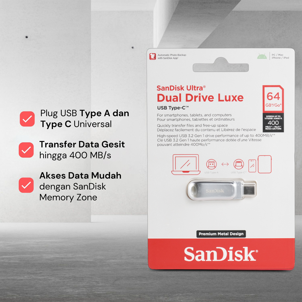 Mencari alat yang bisa digunakan untuk memindah file dari laptop atau PC ke perangkat lainnya? Jika iya, sekarang saatnya Anda menggunakan SanDisk Ultra Dual Drive Luxe. Hadir dengan port USB Type A dan plug USB Type C, Kini Anda dapat memindahkan file ke aneka perangkat menggunakan 1 alat saja. Semakin lengkap dengan kecepatan transfer data hingga 400 MB/s untuk memindahkan banyak file dalam hitungan detik! Fitur Hubungkan Aneka Perangkat