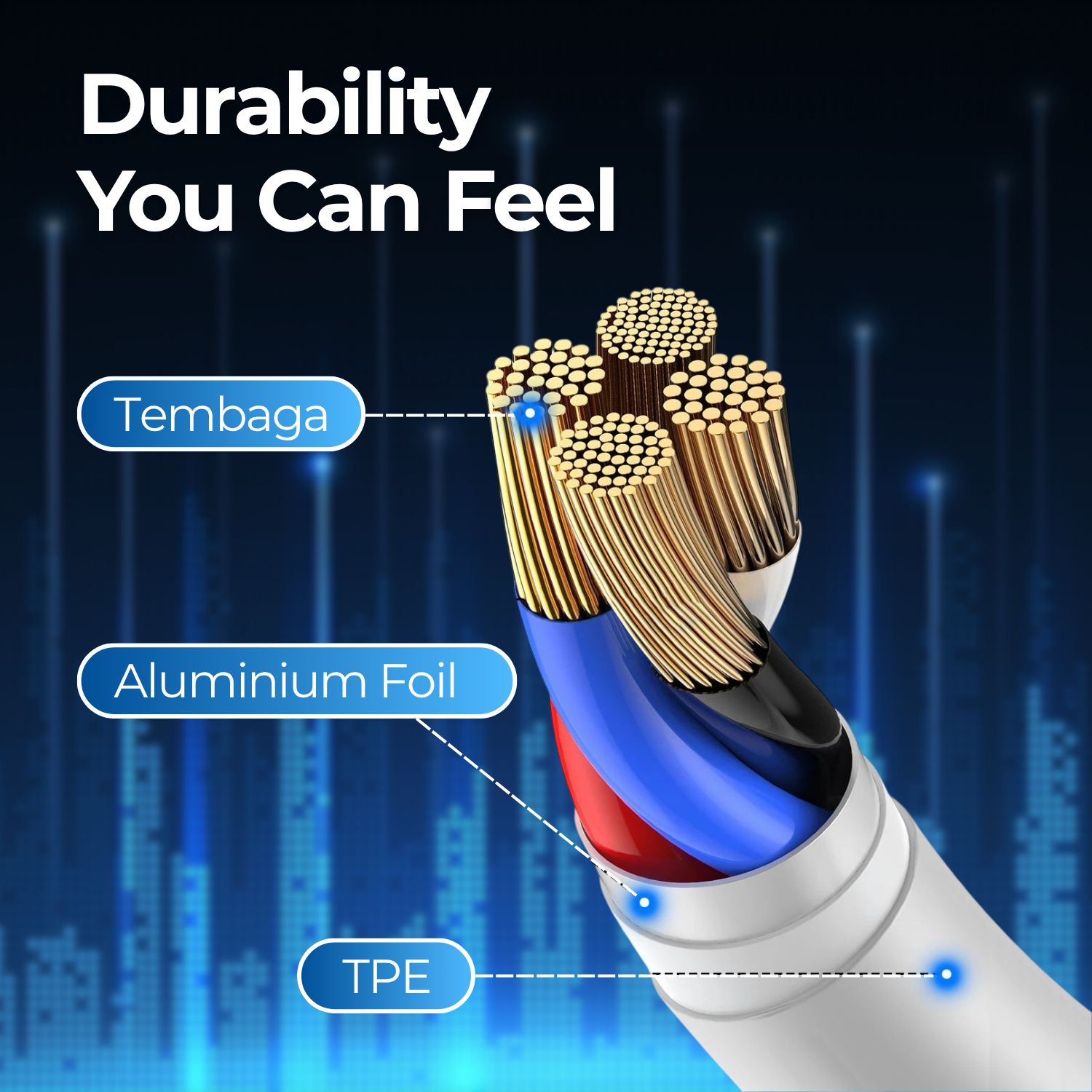 Material Berkualitas Kabel data ini terbuat dari tembaga kualitas tinggi sehingga sangat kokoh, tahan karat, dan tahan korosi. Tak ada kabel yang rusak atau putus karena tertekuk berkat lapisan aluminium foil dan TPE yang fleksibel.