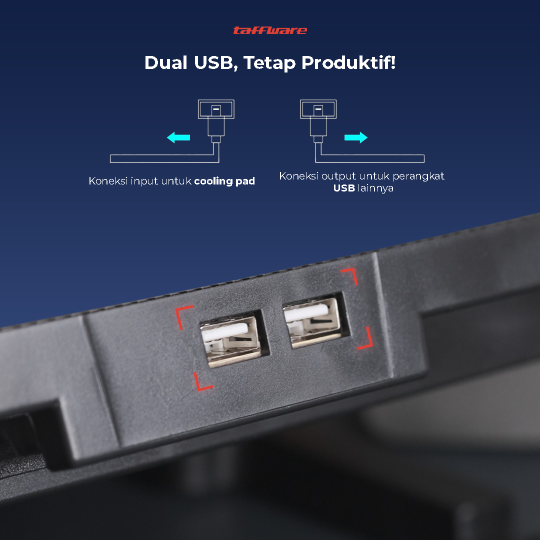 Dual Port Multitasking Tak perlu pilih antara cooling pad atau mouse. Dua port USB tetap aktif bersamaan.