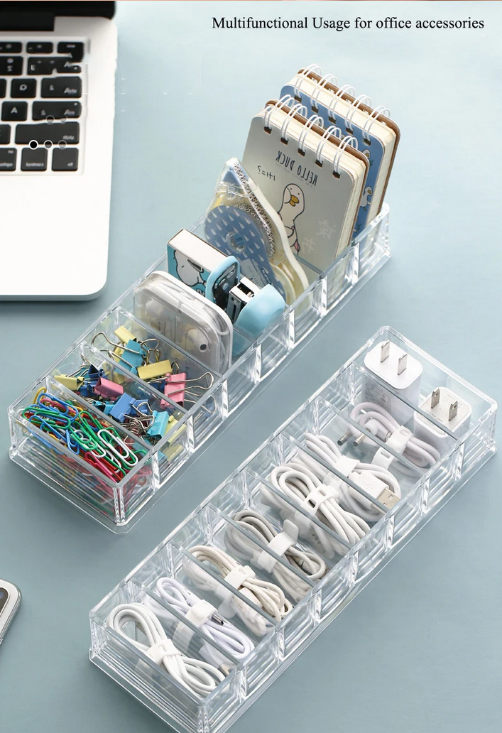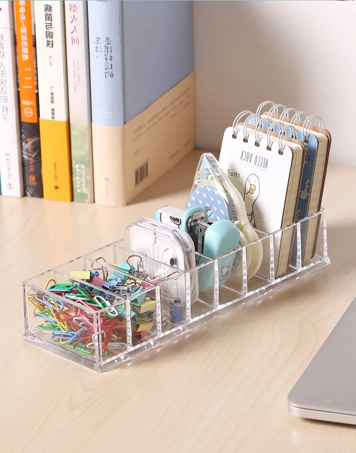 Kotak organizer akrilik dengan 8 kompartemen ini bantu rapikan kabel, alat tulis, dan barang kecil lainnya. Tahan lama, anti air, cocok untuk meja kerja atau belajar anak. Fitur Banyak Ruang Terdapat 8kompartemen yang dapat diisi dengan segalamacam barang-barang kecil terkait kebutuhan. Dapat menaruh kabel, charger, alat tulis kantor,dan barang kecil lainnyasehingga lebih rapi dalam satu tempat yang sama.