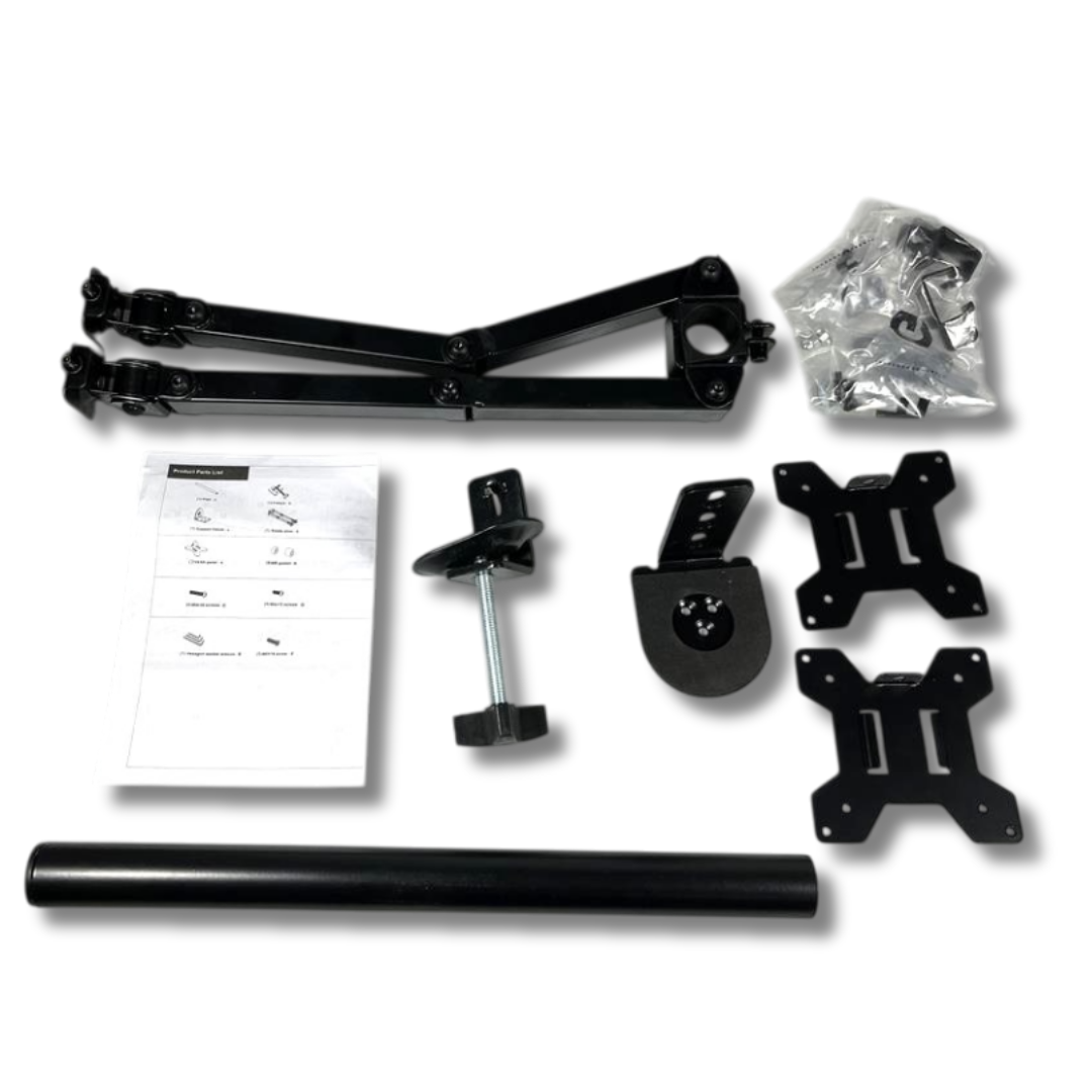 Kelengkapan Produk : - 1 x CONX Bracket Monitor Table Mount Dual Arm VESA 100x100 13-27 Inch TV - KMT-2 - 1 x Tiang - 2 x Bracket VESA - 2 x Hanger - 1 x Clamp Penjepit Meja - 1 x Set Mur dan Baut - 1 x Obeng Plus Bentuk L - 3 x Kunci L - 1 x Panduan Penggunaan