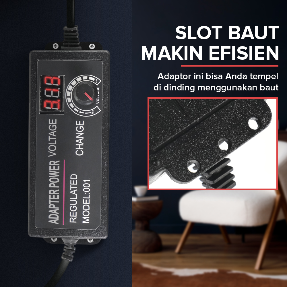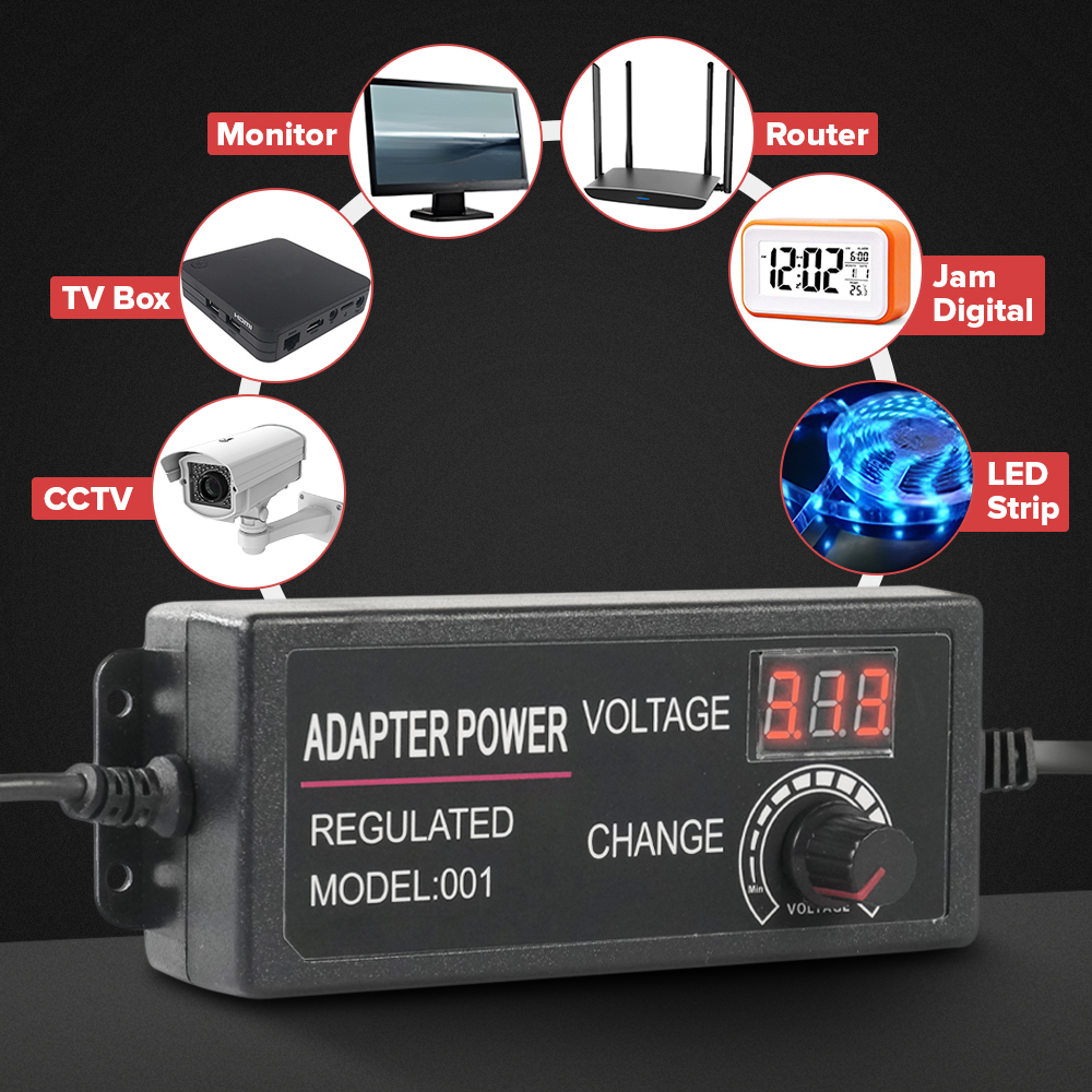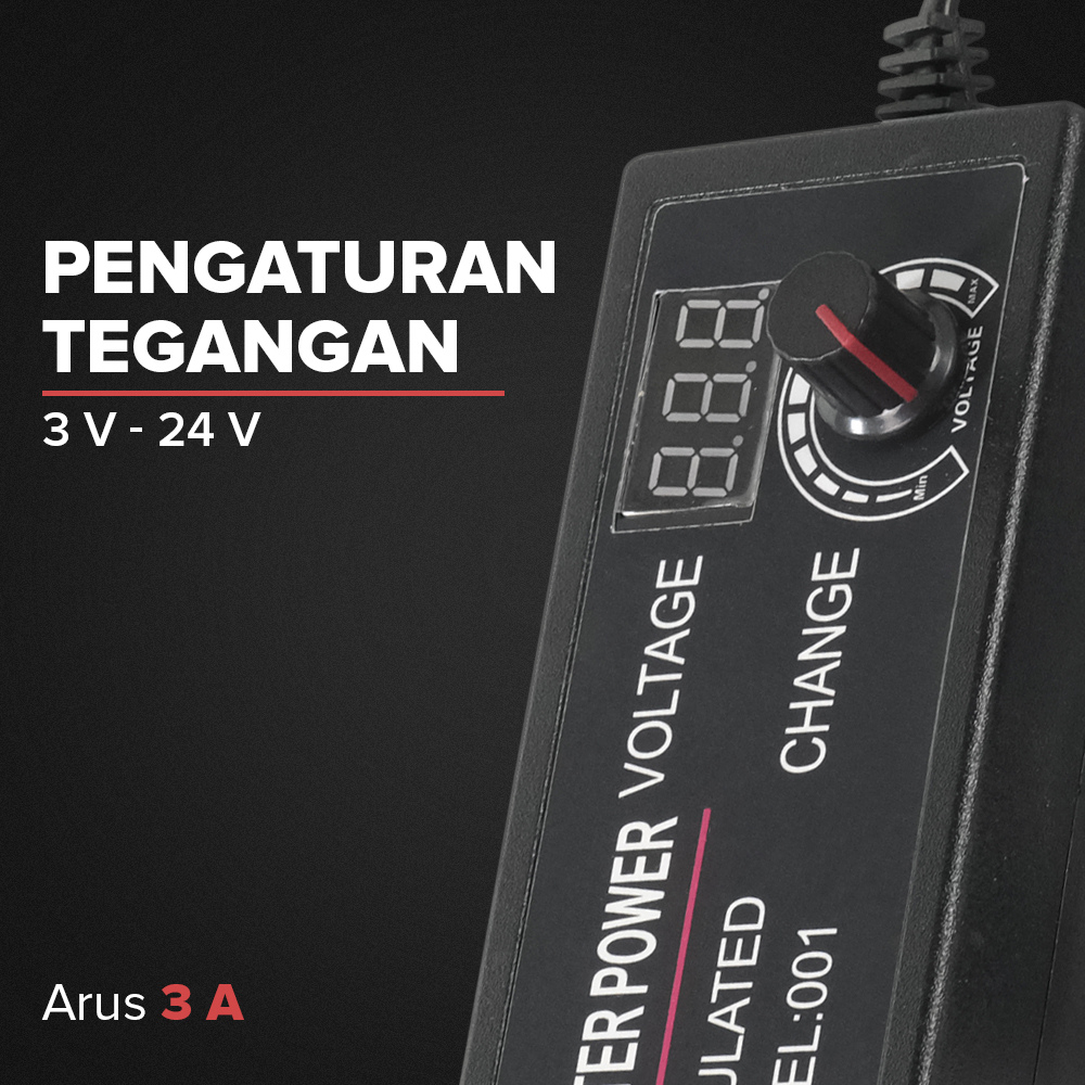 Pemakaian adaptor dengan voltase berbeda atau tidak sesuai tegangan akan merusak produk elektronik yang dimiliki. Kebanyakan adaptor pun tidak bisa diatur output tegangannya.Tapi tidak dengan adaptor power supply ini, karenaAnda bisa mengatur tegangan mulai dari 3 V hingga 24V dengan arus 3 Asesuai dengan besaran yang dibutuhkan perangkat elektronik yang dimiliki. Kini Anda tak perlu khawatir peralatan elektronik akan rusak karena tegangan yang tak sesuai. Fitur Pengaturan Tegangan Pada bodi adaptor terdapat knob pengaturan yang dapat mengubah tegangan mulai dari 3 V sampai dengan maksimal 24 V. Anda dapat menyesuaikan dengan perangkat Anda ketika menggunakan adaptor ini sebagai sumber daya. Untuk memudahkan Anda dalam menyesuaikan tegangan, terdapat layar LCD yang akan menampilkan besaran tegangan ketika Anda memutar knob pengaturan.