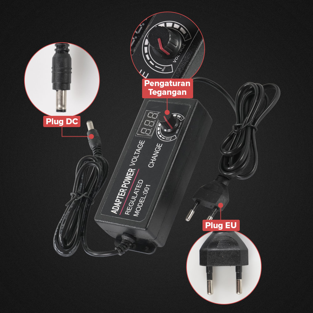 Spesifikasi Voltase Input: AC 100-240 V, 50/60 Hz Voltase Output: DC: 3-24 V Dapat Disesuaikan