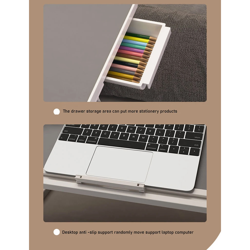 Simpan Barang dengan Rapi Saat belajar atau bekerja, Anda mungkin membutuhkan banyak barang di atas meja. Oleh karena itu, meja lipat laptop ini dibekali laci, dudukan buku, atau tablet, hingga sandaran untuk laptop agar tidak turun saat Anda bekerja dengan sudut yang miring. Barang Anda pun menjadi lebih rapi dan mudah diakses.